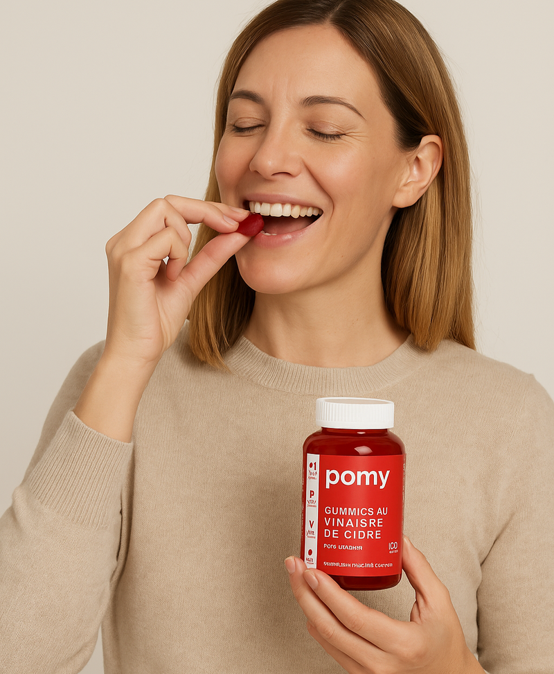 Les gummies Pomy vous offrent tous les bienfaits traditionnels du vinaigre de cidre, amélioration de la digestion, réduction des ballonnements, régulation de la glycémie et contrôle naturel de l’appétit, dans un délicieux bonbon gélifié, doux pour l’estomac et l’émail dentaire. Fini le goût trop fort du vinaigre, place à un rituel quotidien simple et agréable.